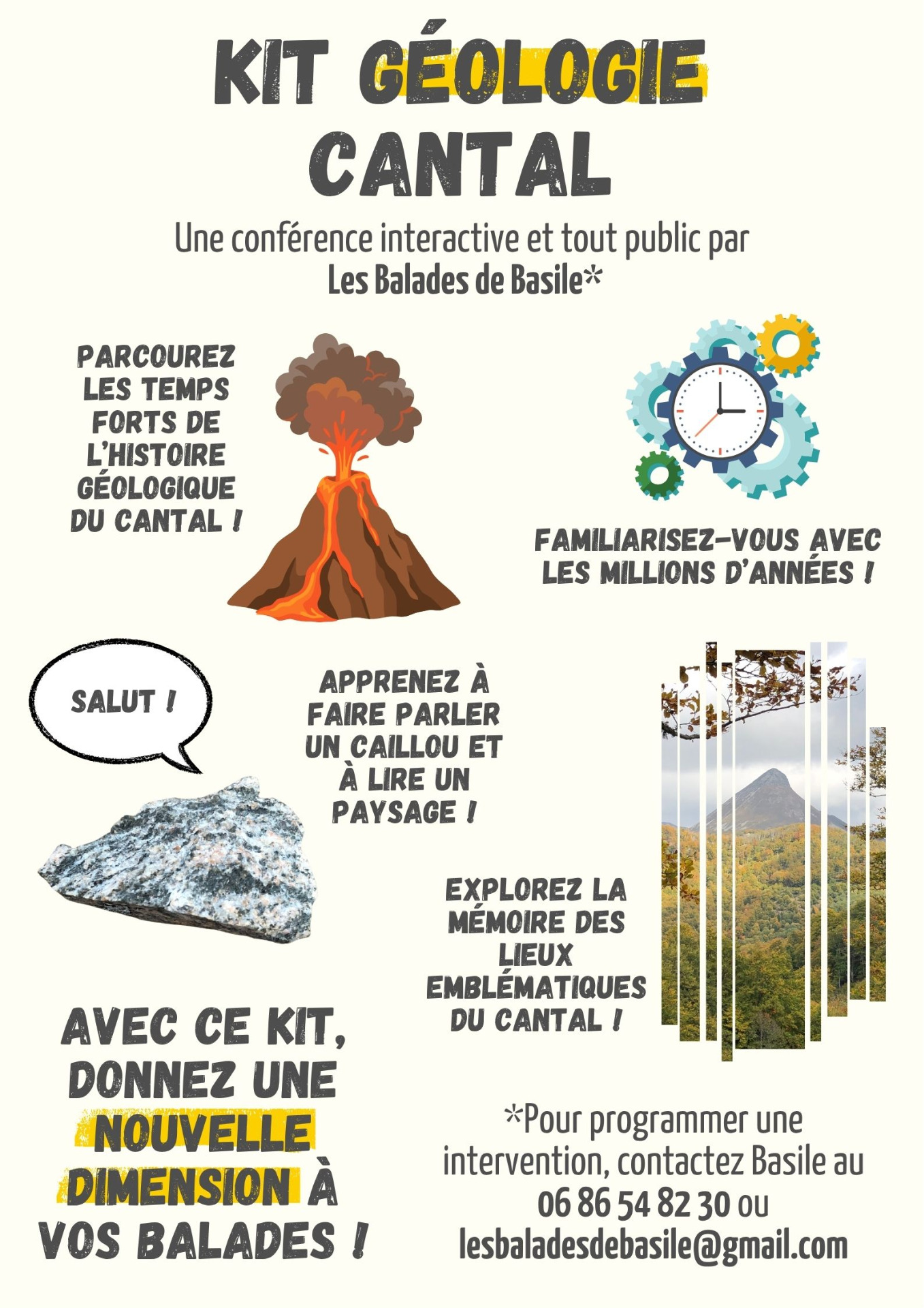 Vous appréciez explorer les montagnes du Cantal en famille et vous vous demandez parfois comment ce rocher est arrivé là ? Vous aimez la nature et êtes curieux ? Cette conférence interactive est faite pour vous ! Le temps d'une heure, constituez-vous un véritable Kit Géologie à emmener partout avec vous, et en particulier dans le Cantal ! Apprenez quelques astuces pour lire les paysages et saisissez-vous des outils du géologue. Devenez autonomes et faites passer vos randonnées dans une autre dimension ! Loin de nuire à la magie de la contemplation, décrypter les bribes du passé d'un paysage le rend encore plus extraordinaire et incroyable ! C'est là toute la beauté de la géologie.